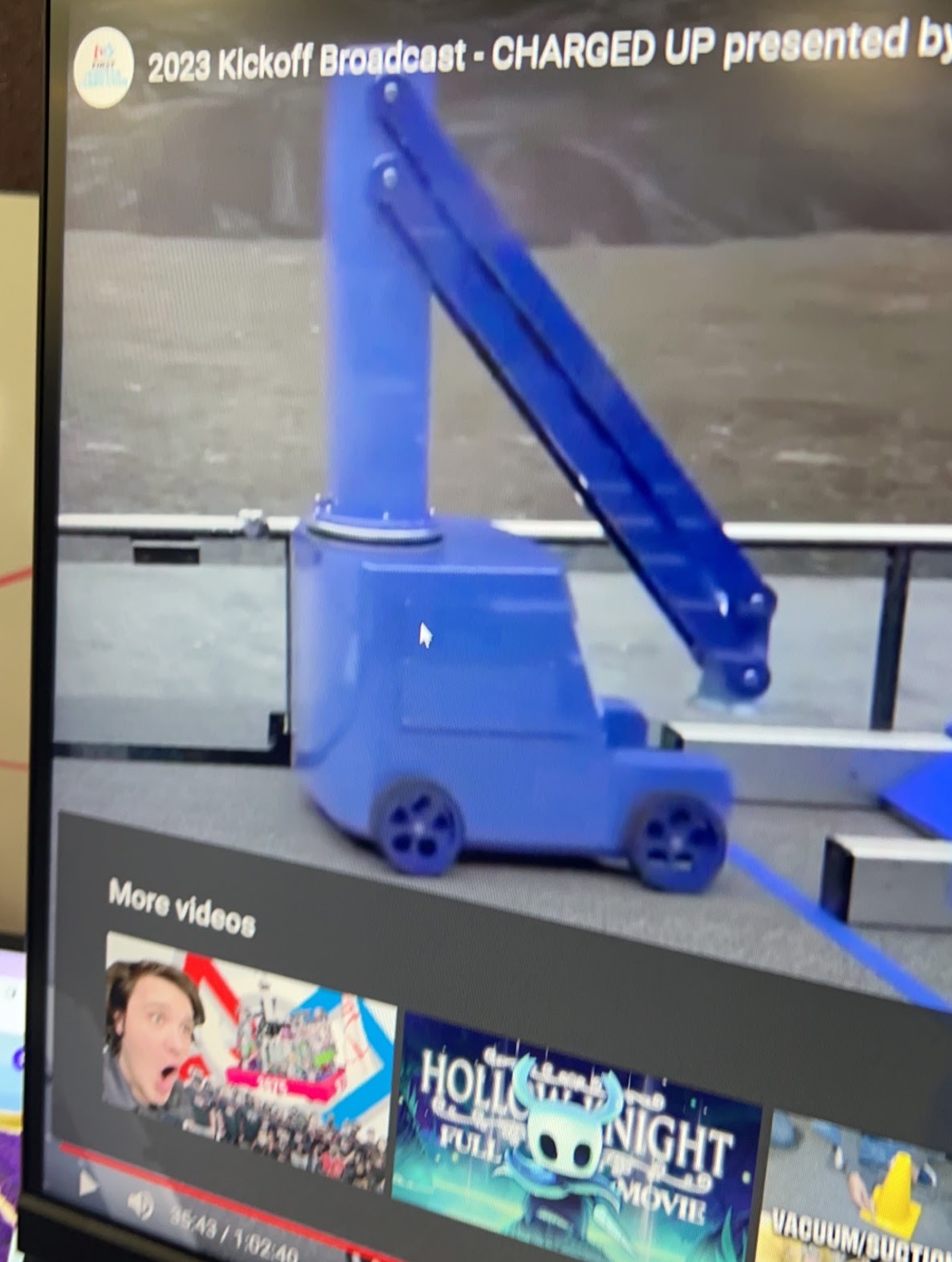 For the 2023 FIRST robotics challenge, we were tasked with picking up cubes and cones, as well as driving onto a “charge pad” and leveling ourselves on it. This robot in the kickoff video served as my inspiration for the design I submitted.