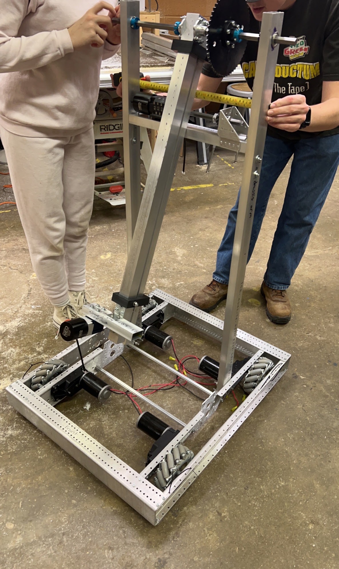 This is a progress update picture from early February. We had made major strides very quickly, but now we were in for a lot of problem-solving issues to come. These issues included the clearance height from the bottom of the bot and the spacing of the arm into the chassis.