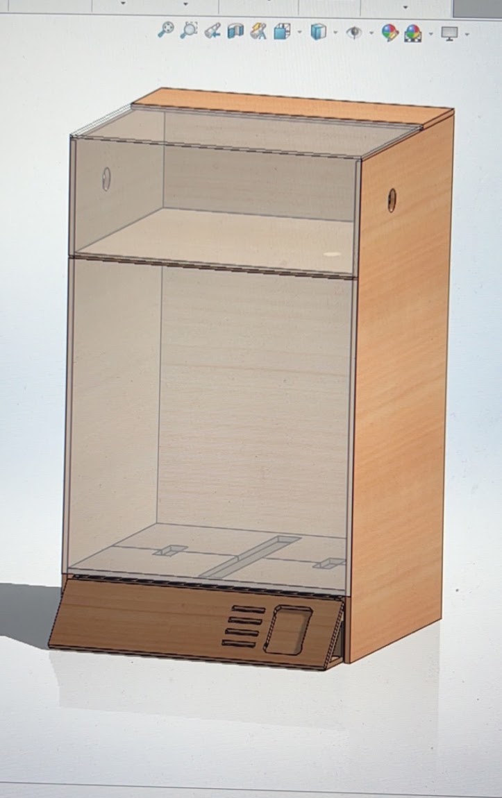 This is the finalized model of the enclosure. I was able to upgrade my original “Electronics Shelf” design to cool the electrical components of my printer while having the printing area at a more controlled “room” temperature