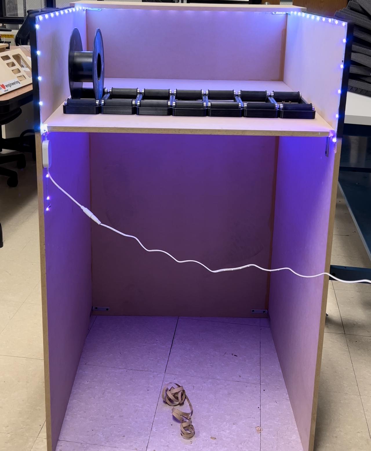 I programmed in LED strips, CNC cut all of the pieces, 3D printed some low-profile spool holders, and made the base frame for the cabinet.