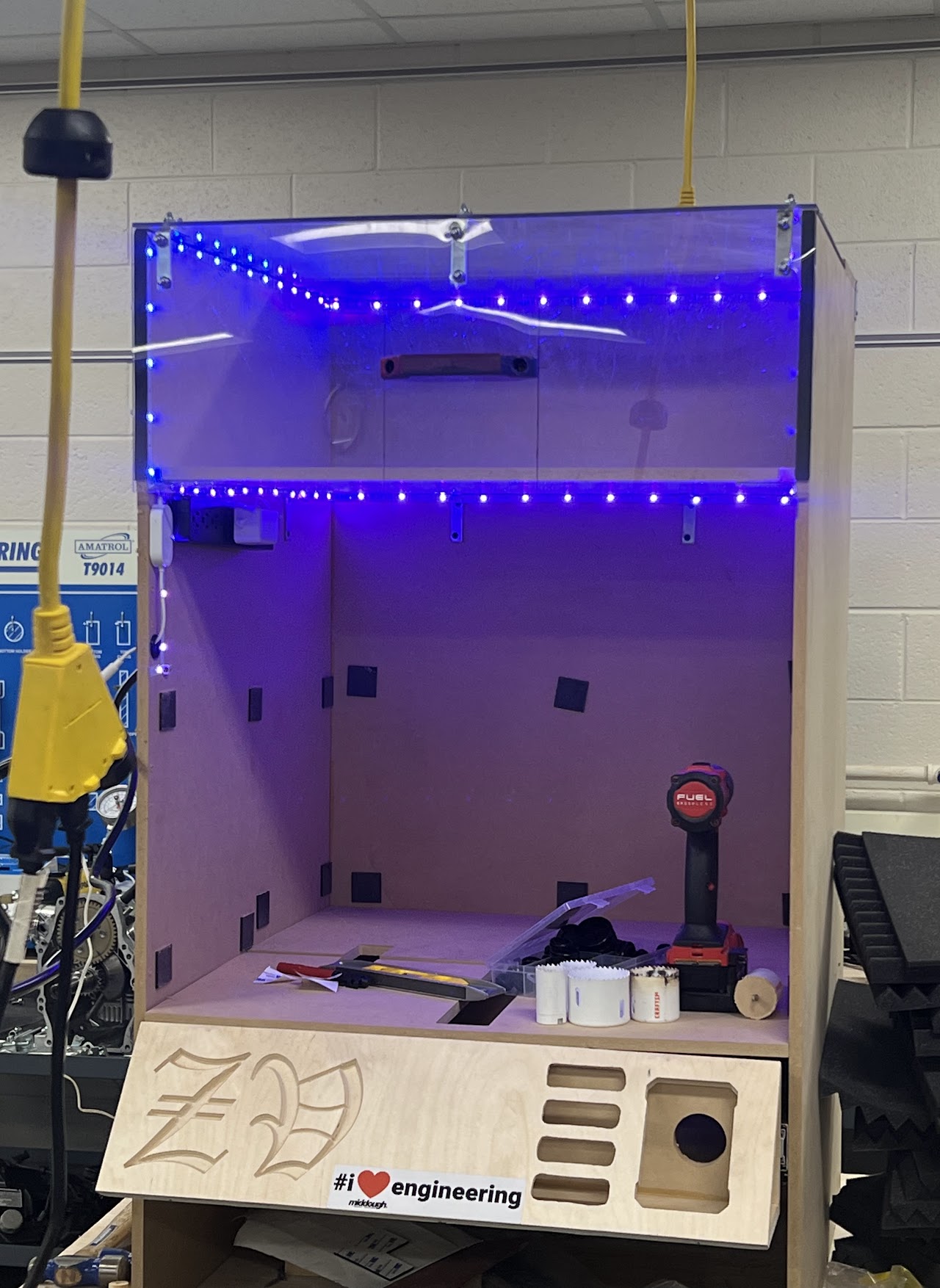 I added a power strip and a cable management through hole into the side of the cabinet, and this was the first LED test of the final product!