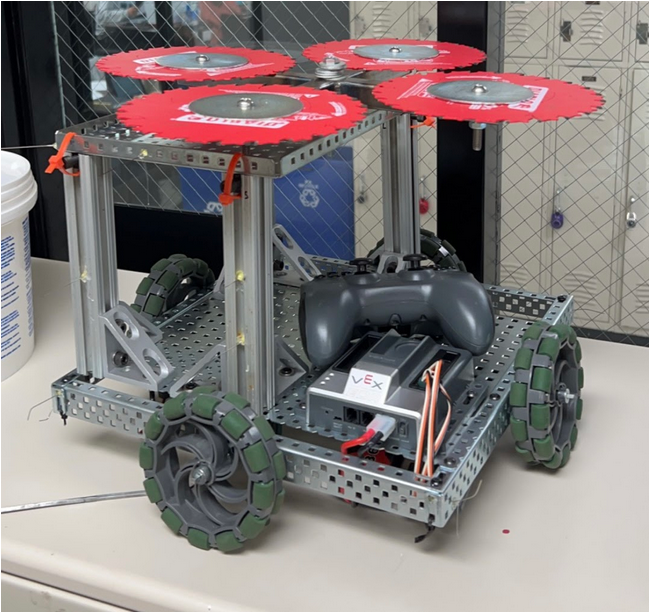 This is our final robot design(as of 3/9/23). We had to change the chassis to create enough ground clearance to get on the pad. Then, we attached our pneumatic grabber and our electronics. We ended up placing in the top 15 in our first competition, and in our 2nd competition,