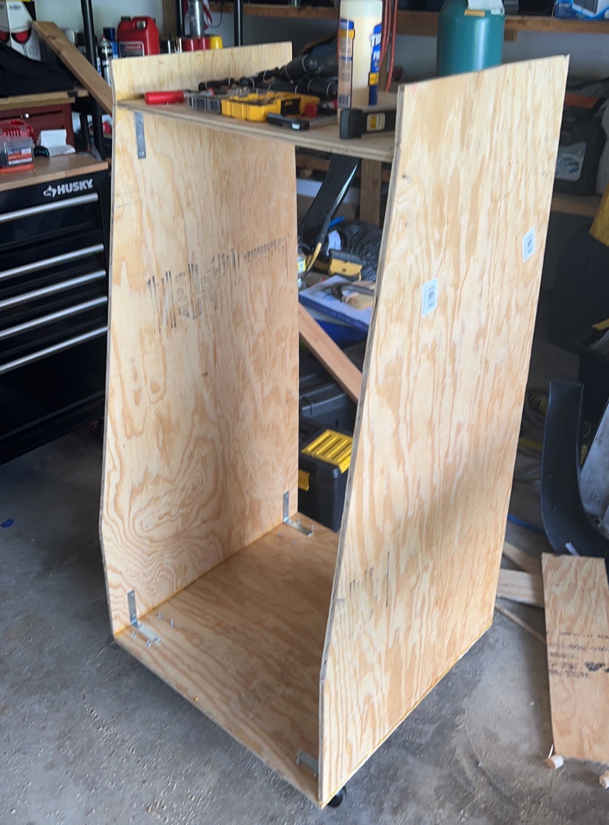 This is the tool cart in action in the small corner of area I get in my parents garage. I used 1/2 in plywood and 1×4 material to build this tool cart and it has revolutionized how I work.